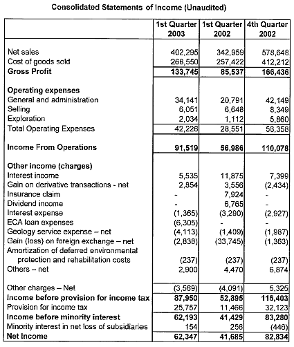 The company said the increase was due to higher nickel and gold prices and steady cost of goods sold.