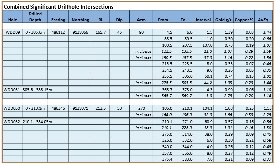 These intersections effectively extend the mineralized zone intersected in WDD050 to a combined (WDD050,WDD052) 165.0 meter wide mineralized zone of 0.81g/t Au and 0.16% Cu from 106.0 to 271.0 meters. Contained within this is an interval of 128.0 meters of 1.02 g/t Au and 0.21% Cu from 106.0 to 234.0 meters. The entire combined 384.1 meter length of the two drill holes averages 0.45 g/t Au and 0.13% Cu.