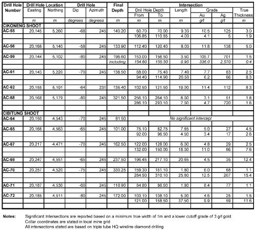 A program of delineation drilling in the resources at the Cikoneng and Cibitung shoots commenced in late August and will be completed in December 2003. A total of 2,413 m of drilling in 13 holes had been completed up to the end of November. This total comprises 968 m of RC percussion pre-collars and 1,445 m of HQ diamond drilling.