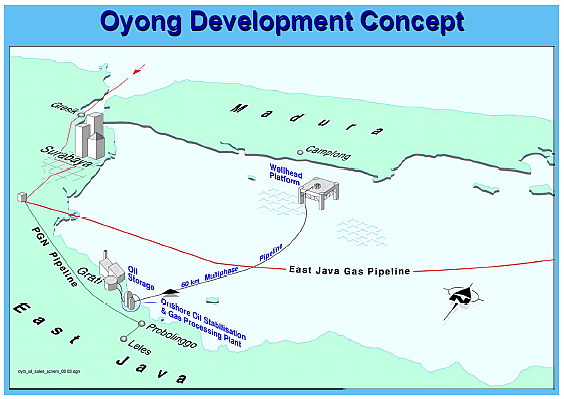 Oyong field will be develop to use a manned Well Head Platform, 2 sub vertical gas wells and 3-5 horizontal oil wells. Oil and gas will then transported through a 14-inch x 60-km multi phase pipeline with a total capacity of 60 million cubic feet per day and 10,000 barrels per day.