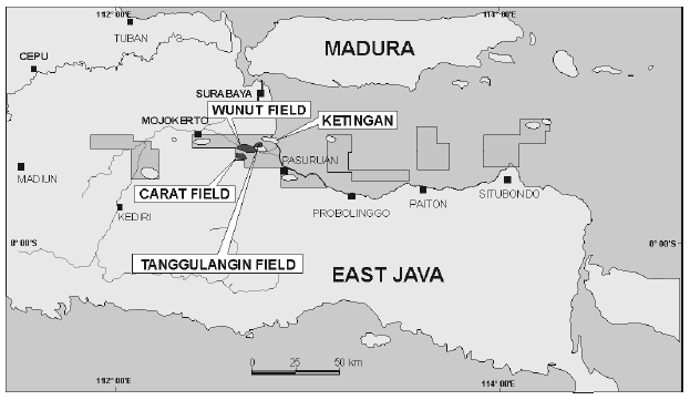 Production is from the Wunut gas field in the central part of the block, located 30 kilometres south of Surabaya. The Wunut field was discovered in 1994 and has been producing since 1999. In late 2001, a discovery was made at Tanggulangin, approximately eight kilometers east of the Wunut facilities. A discovery was made with the next well at Carat, which is located six kilometres south of Wunut. The third well of the program, Grati 1, encountered uneconomic gas shows.