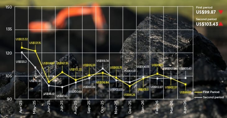 The benchmark HBA for coal with a calorific value of 6,322 kcal/kg GAR, total moisture of 12.26%, sulfur content of 0.66%, and ash of 7.94% was set at $103.43 per tonne, up from $99.87 per tonne in the first half of April.