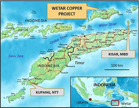 The Wetar Copper Project comprises the development, open pit mining and processing of the high-grade sulphide deposits at Kali Kuning and Lerokis located within 3 kilometers of the coast on Wetar Island. The project benefits from having existing infrastructure in place, particularly a wharf, camp and roads and partially exposed copper ore bodies from a prior gold mining era.