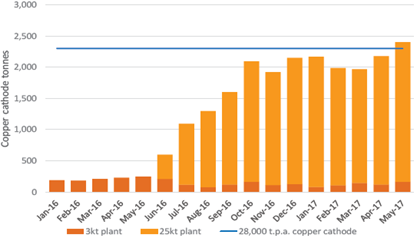 The company said in a statement that the May production exceeded the annualized production target of 28,000 t.p.a copper cathode.