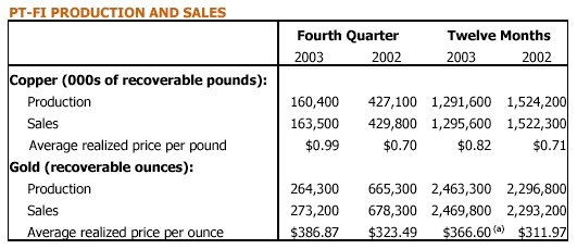Freeport said during the fouth quarter of 2003, mill throughput averaged 142,100 metric tons of ore per day compared with 239,100 metric tons of ore in the fourth quarter of 2002. ?Mill throughput in the first quarter of 2004 is expected to average approximately 100,000 metric tons of ore per day and is expected to return to a level approximating 230,000 metric tons per day once normal operations resume.?