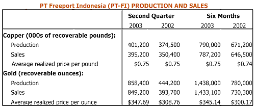 Second-quarter 2003 copper and gold sales exceeded previous quarterly estimates primarily because of the timing of mining ore previously forecast to be mined in the second half of 2003. PT-FI expects its sales for 2003 to approximate 1.4 billion pounds of copper and 2.6 million ounces of gold, with sales for the third quarter of 2003 estimated to approximate 320 million pounds of copper and 640,000 ounces of gold.