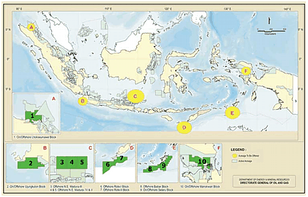 The 10 blocks are the Lhokseumawe block on and offshore Lhokseumawe in Nanggroe Aceh Darussalam (1); the Ujungkulon block on and offshore Ujungkulon in Banten (2); the North East Madura III, IV and V blocks offshore East Java (3, 4, 5); the Rote I and II blocks offshore Rote island in East Nusa Tenggara (6, 7); the Babar block offshore Babar island; the Selaru block offshore Selaru island in Maluku (8, 9); and the Manokwari block on and offshore Berau in Papua (10).
