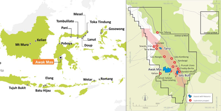 Nusantara holds a 100% beneficial interest in the Awak Mas Project via a 7th Generation Contract of Work (CoW) through its wholly owned subsidiary PT Masmindo Dwi Area. Total JORC Resource at the Awak Mas Project currently stands at 1.74 million ounces of gold.