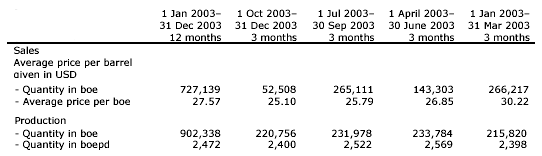 Sales and production for the year ended 31 December 2003 were comprised as follows: