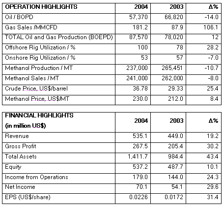 In methanol business, MedcoEnergi, through its subsidiary, PT Medco Methanol Bunyu, strives to improve plant utilization and efficiencies, as it ended the year with production rate of 236,574 metric tons, a slight declined from 2003 volume of 265,500 metric tons.