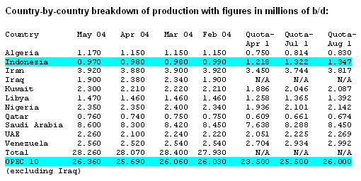 Only Venezuela and Indonesia pumped within their current quotas under the 23.5-mil b/d ceiling; the former having lost output capacity as a result of the two-month strike in the winter of 2002/2003 that reduced production to a trickle, and the latter seeing its production capacity decline to the extent that it is now a net importer of crude. Almost all other member countries exceeded not only their current quotas but also the new quotas scheduled to come into effect in July and August.