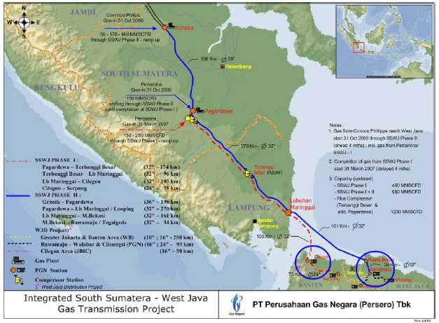 PGN is constructing two pipelines connecting Sumatra and Java islands in order to support higher demand for natural gas in West Java. The SSWJ Phase I is dedicated to transport natural gas from Pertamina?s gas field to PGN?s industrial customers in the western part of West Java. The project was initially expected to be completed by the end of 2006.