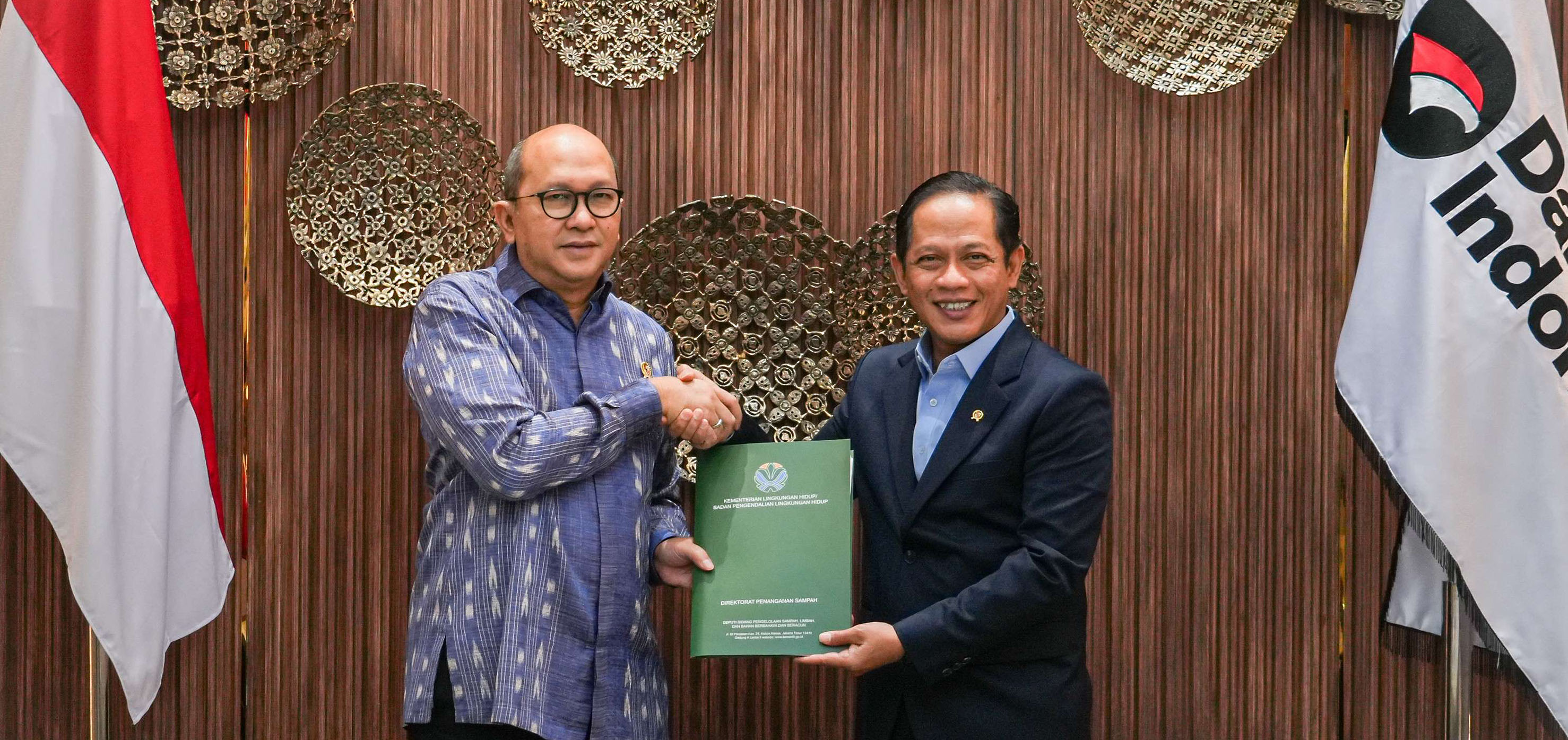 Sovereign wealth fund Danantara Indonesia CEO Rosan Roeslani (left) and Environment Minister Hanif Faisol Nurofiq (right) meet at Wisma Danantara on April 15 to discuss the transfer of prospective land for waste-to-energy (WTE) projects as part of efforts to accelerate Indonesia’s urban waste management program.