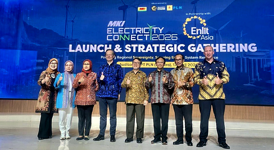 (From left) Noesita Indrian, Vice Chair of Electricity Connect 2026; Chaerani Rahmatullah, CEO of PLN Engineering; Sripeni Inten, Member of the National Energy Council (DEN); Richard Ireland, CEO of Clarion Events Asia; Wanhar Abdurrahim, Deputy Director General of Electricity at the Ministry of Energy and Mineral Resources (ESDM); Adi Priyanto, PLN Director of Retail and Commerce; Satya Yudha, Member of the National Energy Council (DEN); and Simon Hoare, Portfolio Director of Energy at Clarion Events Asia, attend the Enlit Asia – Electricity Connect 2026 launch event at PLN headquarters in Jakarta on Friday (April 17, 2026).