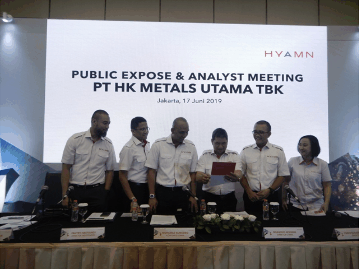 Board of Directors and Commissioner Members of HKMU stand for photo session ahead of Public Expose on Monday (17/06) in Jakarta. From left to right: Pratama Girindra (Director), Fautry Hasfiandy (Director), Muhamad Kuncoro (President Commissioner), Ngasidjo Achmad (President Dirctor), Yudhi Sudarmanto (Director) and Imelda Feryani (Corporate Secretary and Investor Relation  Head). (Petromindo|Thomas)