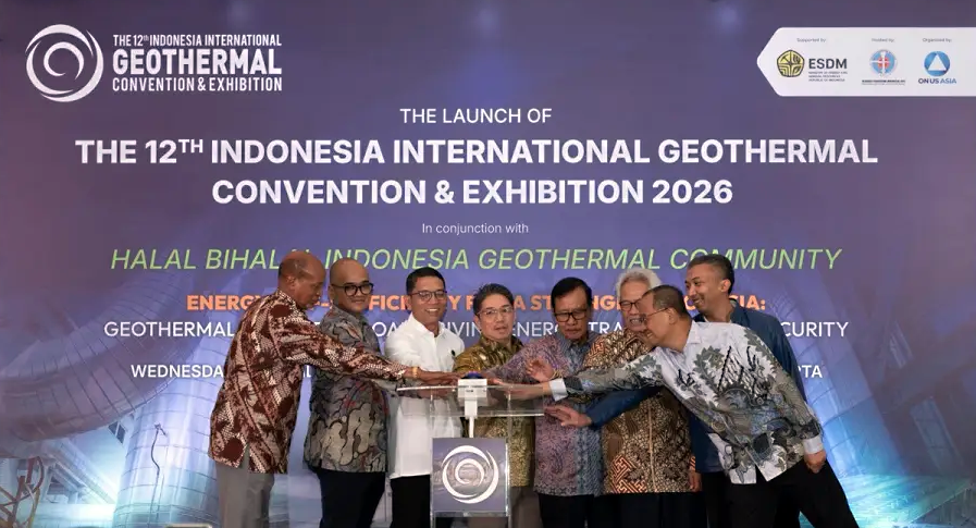 (From left) Kenyan Ambassador to Indonesia Abdirashid Salat Abdille; Chairman of the 12th Indonesia International Geothermal Convention & Exhibition (IIGCE) 2026 Aditya Rakit; National Energy Council (DEN) Secretary-General Dadan Kusdiana; Indonesian Geothermal Association (INAGA/API) President Julfi Hadi; INAGA/API Supervisory Board member Supramu Santosa; DEN member Surono; Director of Geothermal Energy at the Energy and Mineral Resources Ministry Gigih Udi Atmo; and PT Pertamina (Persero) Director of Transformation and Business Sustainability Agung Wicaksono at a press conference to launch the 12th IIGCE 2026 in Jakarta, April 8.