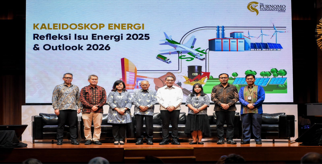 (Left to right) Adhitya Nugraha, Senior Expert and Head of Macroeconomics and Geopolitics at the Pertamina Energy Institute; Yunus Saefulhak, Head of the Energy Policy and Proceedings Facilitation Bureau at the National Energy Council (DEN); Filda C. Yusgiantoro, Chair of the Purnomo Yusgiantoro Center (PYC); Purnomo Yusgiantoro, former Minister of Energy and Mineral Resources (2000–2009); Dadan Kusdiana, Secretary General of the National Energy Council; Tubagus Nugraha, Executive Director for Policy Synchronization of Priority Economic Programs at the National Economic Council; and Danny Rahdiansyah, Coordinator for Energy and Environmental Economic Value at the Directorate of Resources and Industrialization, Ministry of Foreign Affairs, pose for a group photo at the “Energy Kaleidoscope: Reflections on Energy Issues in 2025 and Outlook for 2026” event in Jakarta on Tuesday (Jan 13, 2026), organized by the Purnomo Yusgiantoro Center (PYC).