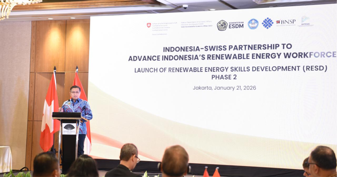 Head of the Human Resources Development Agency (BPSDM) at the Ministry of Energy and Mineral Resources (ESDM) Prahoro Nurtjahyo speaks at the launch of the Renewable Energy Skills Development (RESD) Phase II program in Jakarta on Wednesday (Jan. 21). He said the success of Indonesia’s energy transition depends heavily on the availability of sustainable human resources and that RESD Phase II aims to align vocational education with industry needs to produce renewable energy professionals ready to work and lead change.
