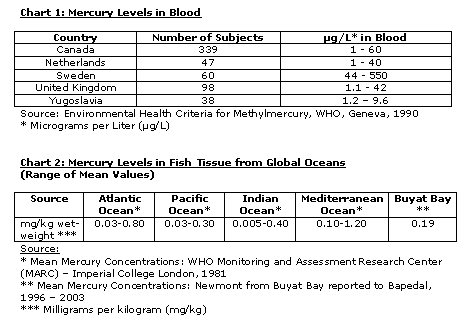 ?It is universally acknowledged that coastal communities that eat a lot of fish naturally have higher mercury levels in their blood. For example, the average value of mercury in blood from an extensive global study (1990) of high fish-eating communities was 44 ?g/L. A review of ninety-seven international studies gave a 95 percentile level of 83 ?g/L,? Dr. Bentley explained.