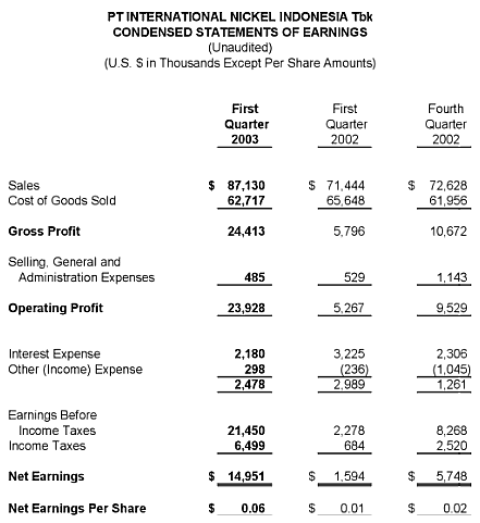 Subsequent to the end of the first quarter, the shareholders of PT Inco approved a final dividend for 2002 of $0.01 per share, payable on May 19, 2003 to shareholders of record on May 2, 2003. (alex)