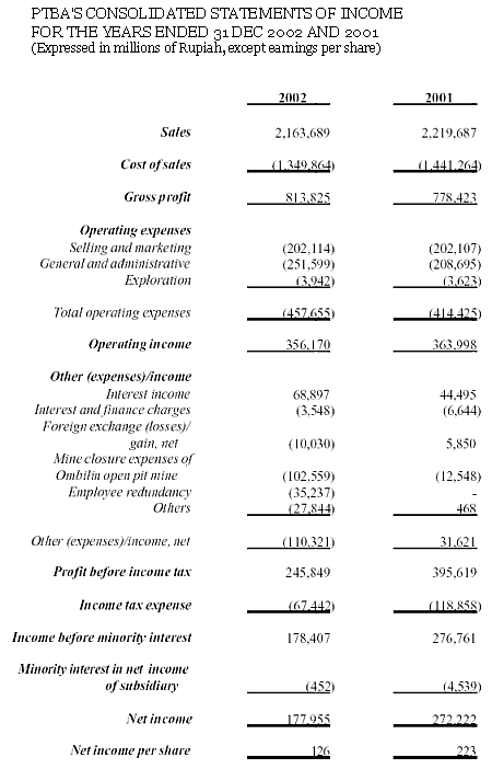 JSX-listed State coal miner PT Tambang Batubara Bukit Asam (PTBA) booked 2002 net income of Rp. 177.955 billion (US$ = Rp.8,900) or Rp.126 per share, lower than 2001 net profit of 272.222 billion or Rp.223 in the previous year.