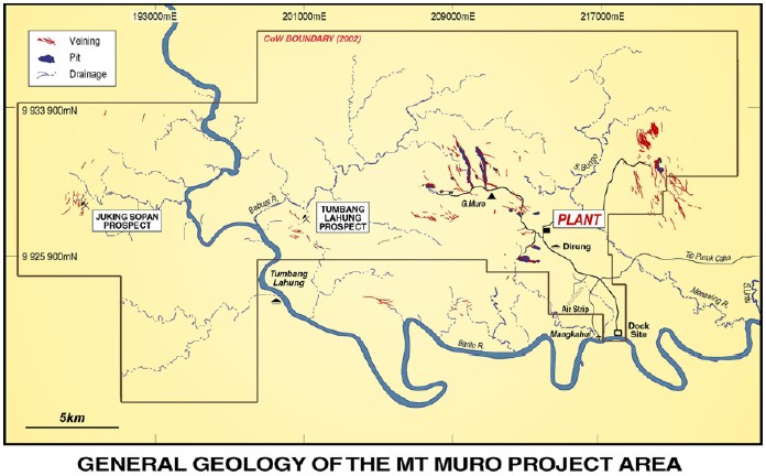 Drilling has continued at the Juking Sopan region 22 kilometers to the west of the Mt Muro minesite and to-date a total of 91 holes have been completed. Results received todate (following those reported in the December 2003 quarter activities report) have yielded further encouraging intersections along the steeply dipping Tasat Vein including: