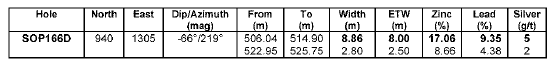 July 21, 2005 ? SOP166D, the first hole of a new programme, intersected high grades in massive sulphides from depths of 506.04 - 513.00m and 513.46 - 514.90m with additional bands of sulphides between 522.95 ? 525.75m. Assay results have now been received and are tabulated below: