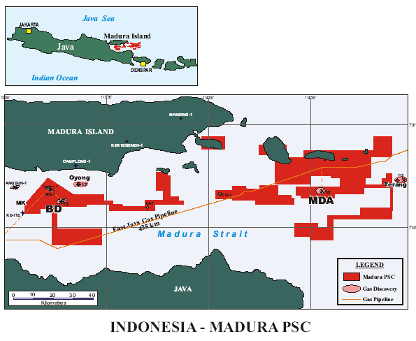 The Madura block is located about 40 kilometres north of East Java and covers 2,794 square kilometres of exploration acreage. Nine wells have been drilled on the block since 1984, resulting in the two discoveries which are entitled Madura BD and MDA.