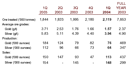 The company also reported that gold sales had increased in the quarter to 113,000 ounces compared to the fourth quarter last year of 47,000 ounces.