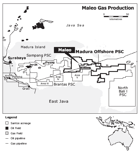 Santos farmed into the Madura Offshore PSC following the Oyong oil and gas discovery made in the adjoining Sampang PSC in August 2001. The Maleo gas field was discovered by the Santos led joint venture in June 2002.