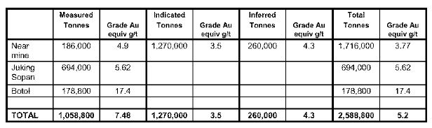 Drilling has continued throughout the quarter concentrating on the Tumbang Lahung area (Botol vein) and completing initial drilling at Juking Sopan. A progressive resource calculation has been completed at Tumbang Lahung which has defined 178,800 tons of ore at 14.5 g/t gold and 183 g/t silver (containing 100,000 oz?s of gold equivalent). At Juking Sopan resources have been upgraded by 16,000 oz gold equivalent from the previous quarter. Total resources at Mt Muro summarised now stand at 433,000 oz gold equivalent.