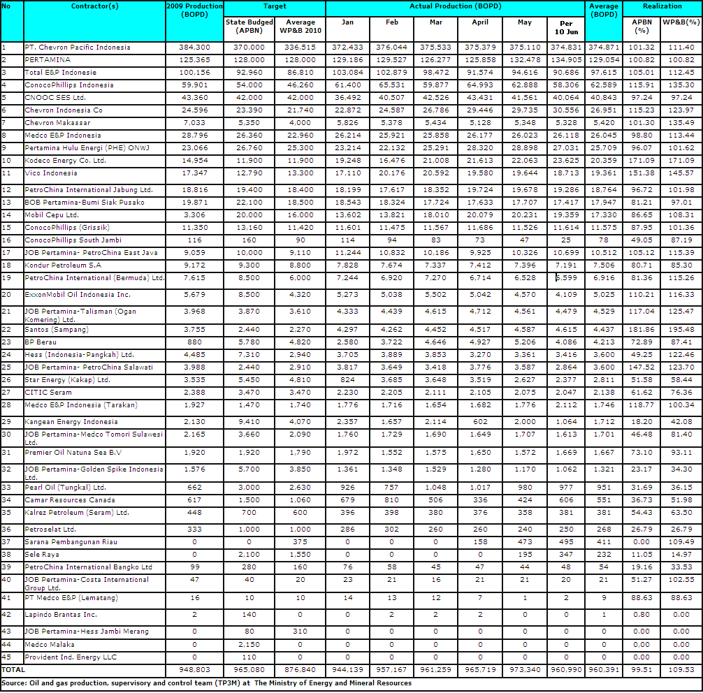Table: Indonesian oil, condensate production during Jan-June period