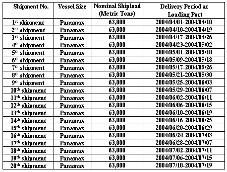 (b) Under the cases of combining two panamax shipments into one capesize shipment, the nominal shipload of such capesize shipment shall be 126,000 metric tons plus or minus ten percent (10%) at shipmaster?s option. Unless otherwise agreed, the delivery schedule of such capesize shipment will be the arithmetic average in time of the delivery schedules of these two (2) gearless panamax shipments. In addition, the F.O.B.T. Base price of such capesize shipment shall be the average of the F.O.B.T. price of these two (2) gearless panamax shipments. The loading rate and demurrage/despatch rate of said capesize shipments are listed as follows: