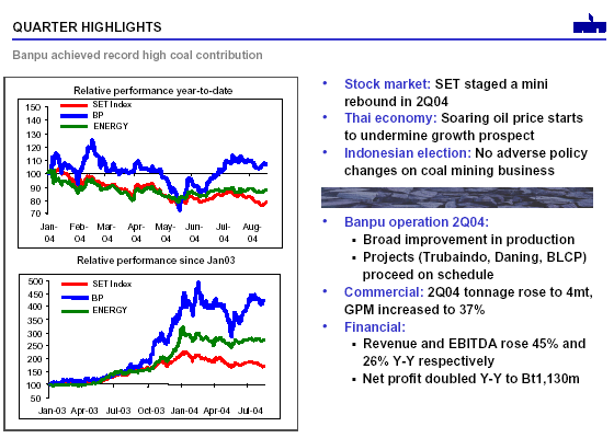 The following graphics highlight Banpu's latest quarterly performance ended Jun 04, released on August 20, 2004.