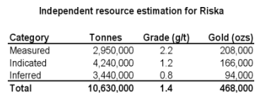 The company said independent resource estimation for Riska has been completed based on 22 holes previously drilled by Newmont Mining Corporation and 25 holes drilled by Avocet to the end of August with the result showed gold resources of 468,000 ounces.